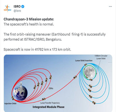 इसरो ने कहा, ‘चंद्रयान-3 मिशन अपडेट: अंतरिक्ष यान की हालत सामान्य है. कक्षा में आगे बढ़ाने की पहली कवायद ISTRAC/इसरो, बेंगलुरु द्वारा सफलतापूर्वक पूरी की गई. अंतरिक्ष यान अब 41762 किलोमीटर (किमी) गुना 173 किमी कक्षा में है.’